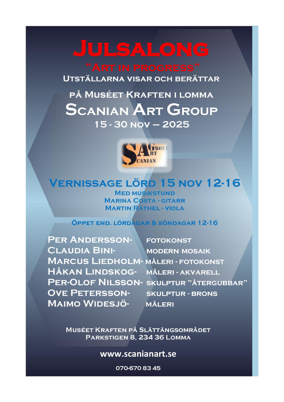 Vernissagedagen inleds c:a kl 12:30 med invigning, varpå en musikstund om c:a 20 min följer.